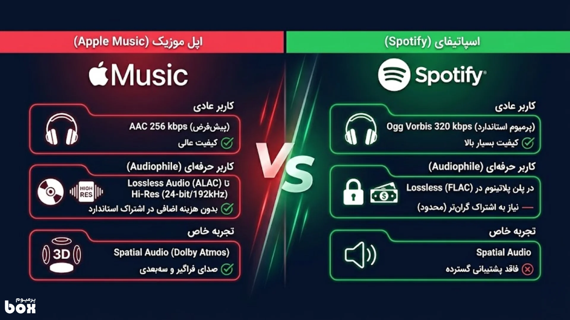 در نهایت، هر دو سرویس صدای باکیفیتی ارائه میکنند و انتخاب میان آنها بستگی به نیازها و سلیقهی شما دارد. اگر امکانش را دارید، بد نیست هر دو را امتحان کنید و با گوشهای خودتان قضاوت کنید که کدام را ترجیح میدهید. فراموش نکنید که اشتراک هر دوی این سرویسها (چه اپل موزیک و چه اسپاتیفای پرمیوم) را میتوانید از طریق فروشگاه پرمیوم باکس تهیه کنید و از شنیدن موسیقی با بهترین کیفیت لذت ببرید. مطمئن باشید چه طرفدار اپل باشید و چه اسپاتیفای، دنیایی از موسیقی با کیفیت عالی در انتظار شماست!