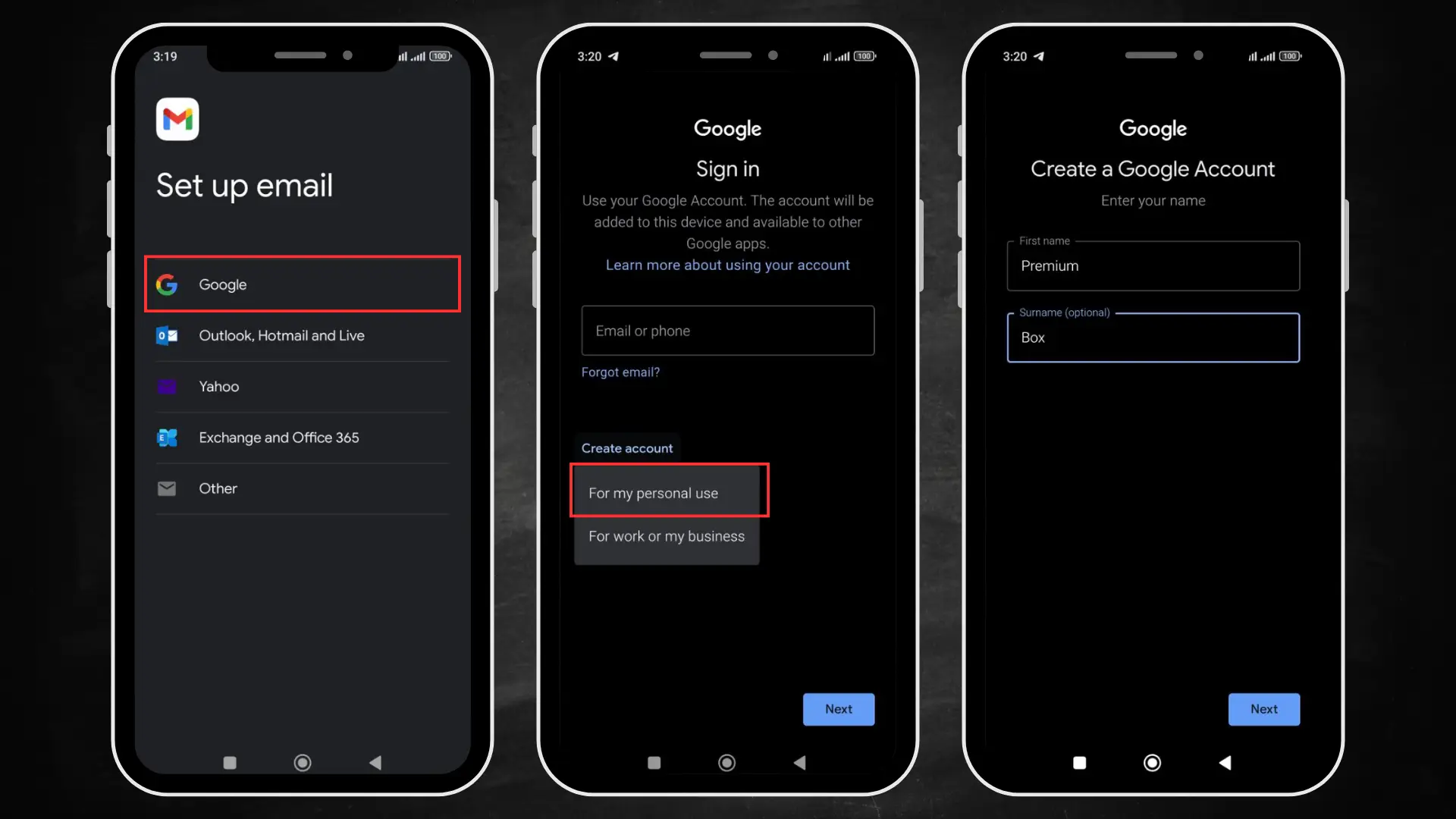 در صفحه بعدی با عنوان «Set up email»، گزینههای مختلفی برای سرویسدهندگان ایمیل نمایش داده میشود. در این مرحله، «Google» را به عنوان سرویسدهنده مورد نظر خود انتخاب کنید. سیستم شما را به صفحه ورود به حساب گوگل هدایت میکند. از آنجایی که قصد ساخت یک حساب جدید را دارید، به جای وارد کردن ایمیل، روی لینک «Create account» (ایجاد حساب) ضربه بزنید. سپس، از میان گزینههای نمایش داده شده، «For my personal use» (برای استفاده شخصی من) را انتخاب کنید تا مراحل ثبت اطلاعات اولیه آغاز شود.