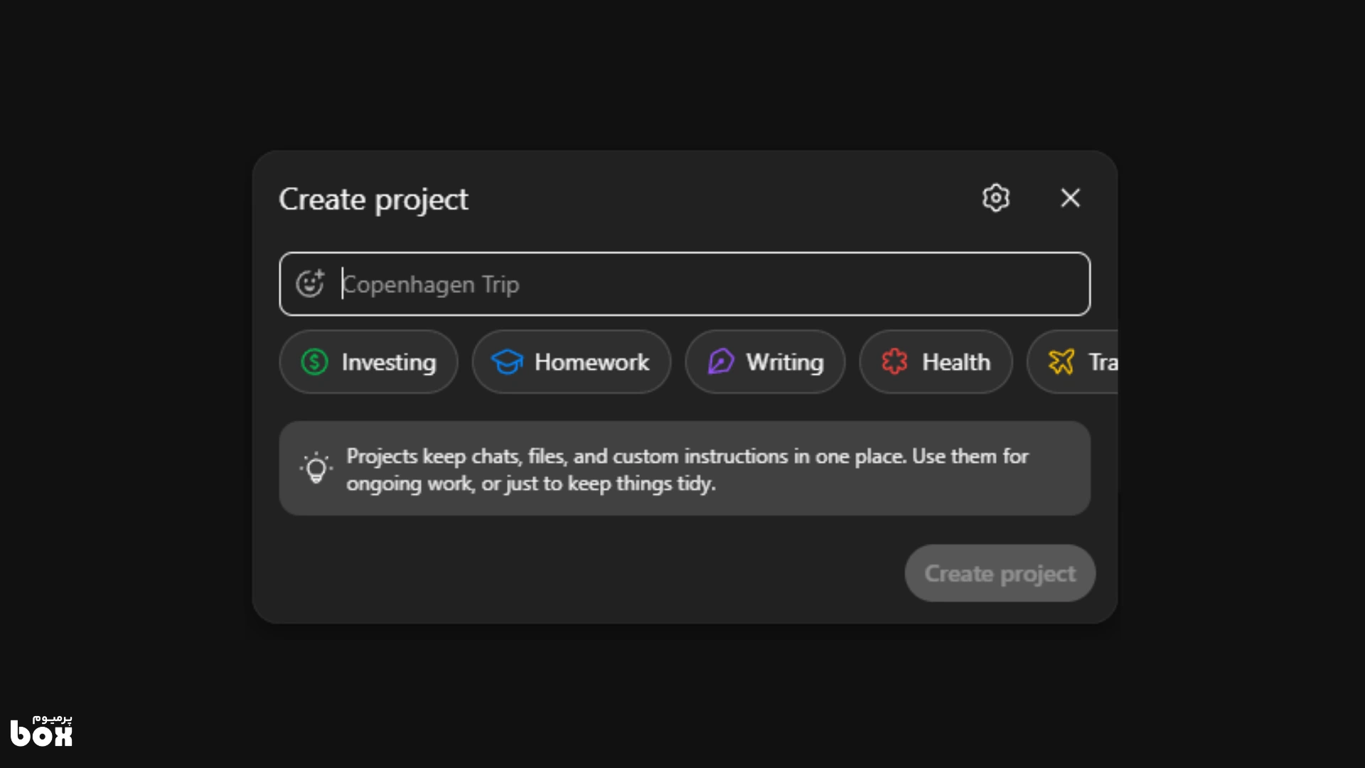 اولین گام برای انتقال چتها به اکانت جدید، ایجاد یک پروژه جدید در اکانت فعلی است. پروژهها در ChatGPT به شما کمک میکنند تا چتها و گفتگوهای مختلف خود را در یک مکان واحد ذخیره کنید.