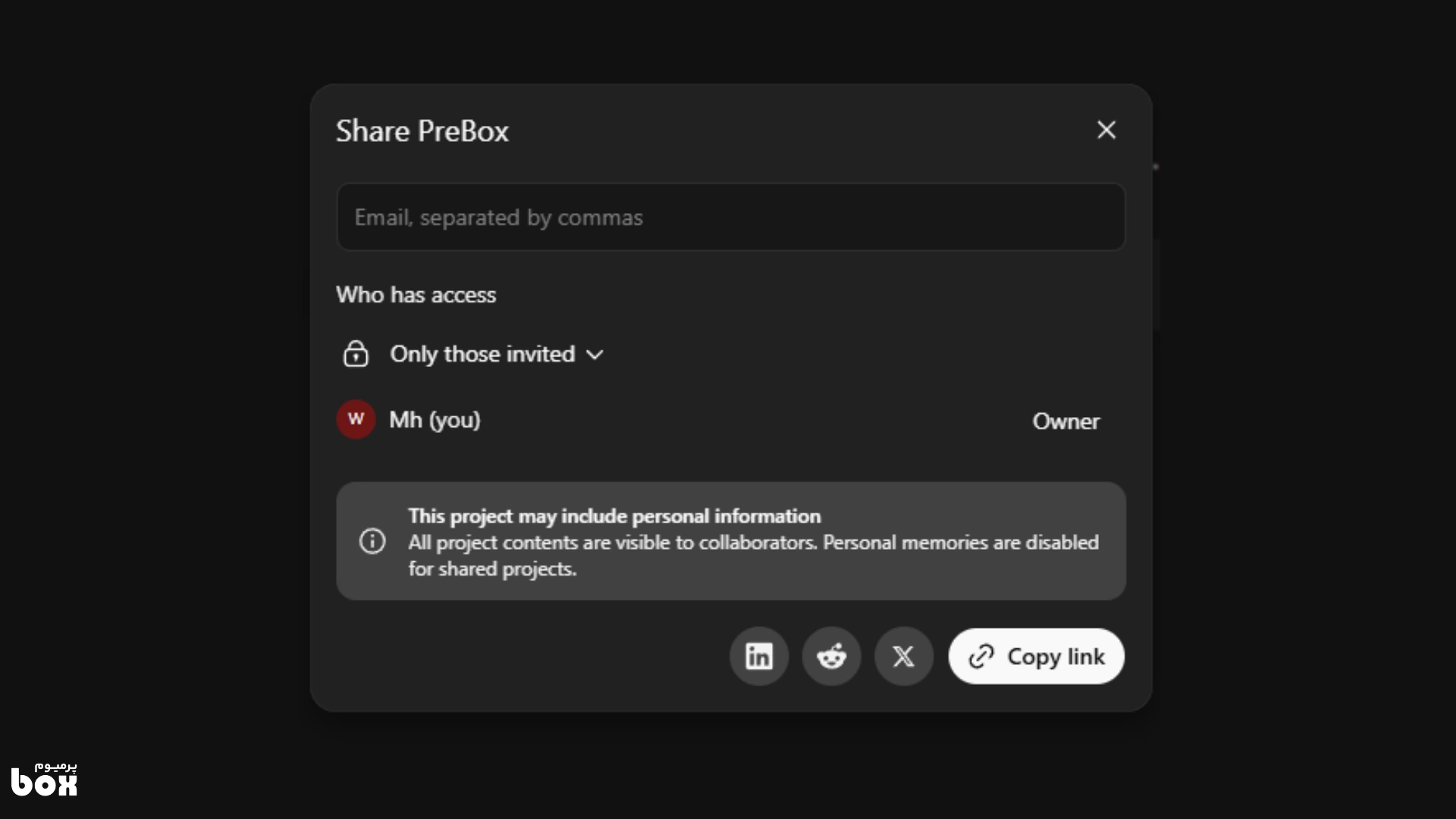 پس از اضافه کردن چتها به پروژه جدید، باید پروژه را به اشتراک بگذارید تا بتوانید آن را در اکانت جدید مشاهده کنید.